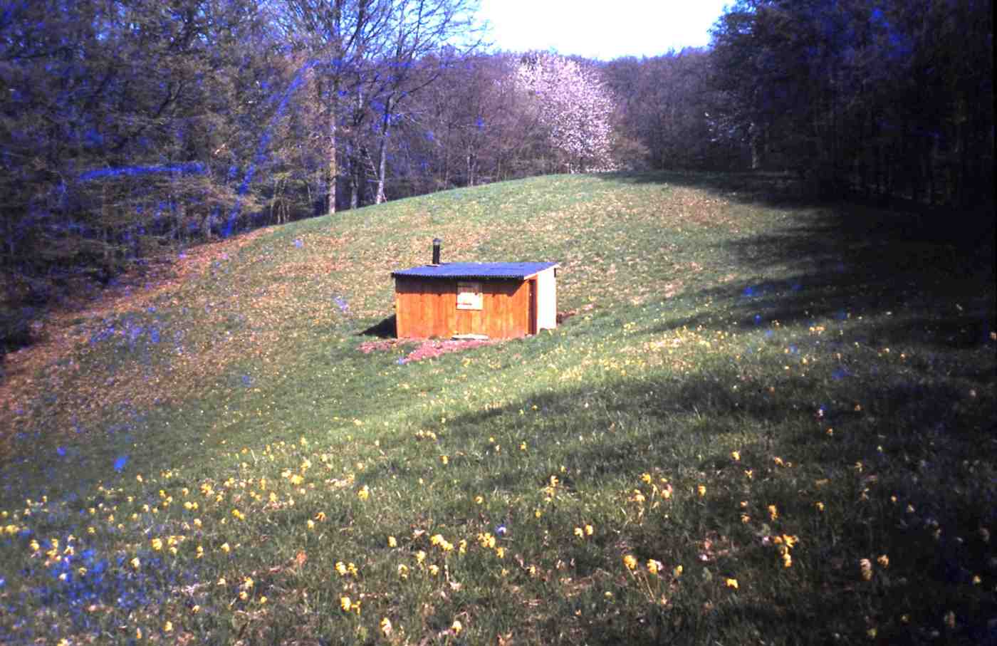 Das Bild zeigt das Stück Waldwiese meiner Familie in der Schlüsselblumenzeit, wahrscheinlich 1981 (oder 1982? – die Verunsicherung rührt von den anderen Bildern aus derselben Diakassette). Auf der Wiese steht eine kleine Hütte, die mein Vater selbst gebaut hat. Sie dürfte zum Zeitpunkt der Aufnahme ganz neu gewesen sein, und er hat dieses Bild selbst aufgenommen. Die Wiese nannten wir auch Schlüsselblumenwiese, weil sie jedes Jahr im frühen Frühjahr – mal dichter, mal lichter – mit gelb blühenden Schlüsselblumen bedeckt stand. Während ich diese Zeilen schreibe (3. April 2020), blühen in Unterfranken auch gerade wieder die Schlüsselblumen. Ist es eine Koinzidenz? -Jedenfalls bin ich vorgestern zufällig über dieses Bild gestoßen, nachdem ich ein paar Stunden im Wald war und Schlüsselblumen gesehen habe.
