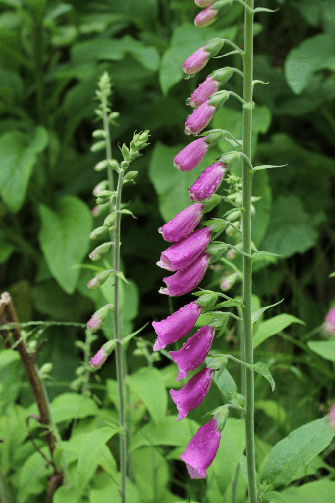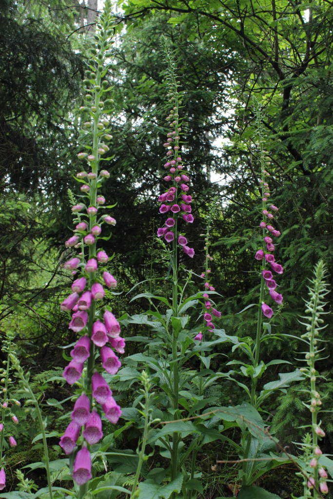 Man sollte allerdings vorsichtig sein mit dem Fingerhut, denn die Pflanze ist hochgiftig. Wie viele Giftpflanzen ist sie gleichzeitig auch eine Heilpflanze, und sie taucht außerdem auf zahlreichen Märchenillustrationen auf. Auf den britischen Inseln wurde sich erzählt, dass die merkwürdige Zeichnung der Blüteninnenseite die Fingerabdrücke von Feen sein sollen (Wikipedia). Diese hätten die Fingerhüte den Füchsen als Handschuhe überlassen, was erkläre, warum der Fuchs oft unbemerkt in Ställe eindringen könne. Dementsprechend heißt der Fingerhut auf Englisch Foxglove.
