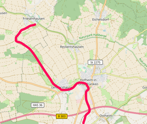 Beim Dorf Lendershausen, das praktisch mit Hofheim verwachsen ist, ließ ich den Lauf der Nassach bis zu seiner Mündung hinter mir, wo ich ihn auf meinem weiteren Weg nach Schweinfurt später noch einmal kurz überqueren würde. Man könnte hinter Hofheim, ab Rügheim, auch der Nassach bis nach Haßfurt folgen, doch ich entschied mich für den längeren Weg über Königsberg. Der Streckenabschnitt von Hofheim über Königsberg nach Haßfurt besteht nämlich aus einem ausgebauten Radweg, der einen alten Schienenverlauf ersetzt: den des sogenannten „Hofheimerles“. Auf diesem Streckenabschnitt sind alle Steigungen problemlos bewältigbar, und zu großen Teilen ist die Strecke sogar fast eben. Doch bevor ich zum weiteren Weg komme, verdient auch Hofheim kurz noch Erwähnung.