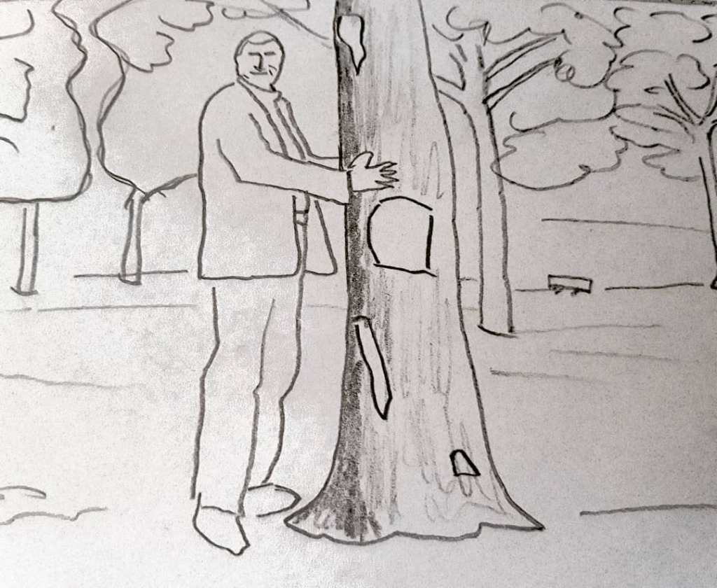 Vom Baum, dessen Stammumfang optisch ungefähr der Leibesfülle von Markus Söder entspricht, ist nur der untere Teil zu sehen. Es ist zu sehen, wie der Stamm in die grüne Wiese übergeht — nicht jedoch die Äste, Zweige und Blätter. Die Baumart ist schwer bestimmbar: es könnte sich um eine Konifere handeln, es könnte aber auch ein Laubbaum sein. Sicher ist nur, dass sich der Baum von den anderen Bäumen im Bild unterscheidet, bei denen es sich um Platanen handelt. Es mag sich um eine Spitzfindigkeit meinerseits handeln, auch die übrigen Bäume in die Betrachtung miteinzubeziehen — aber ich will es darauf ankommen lassen.