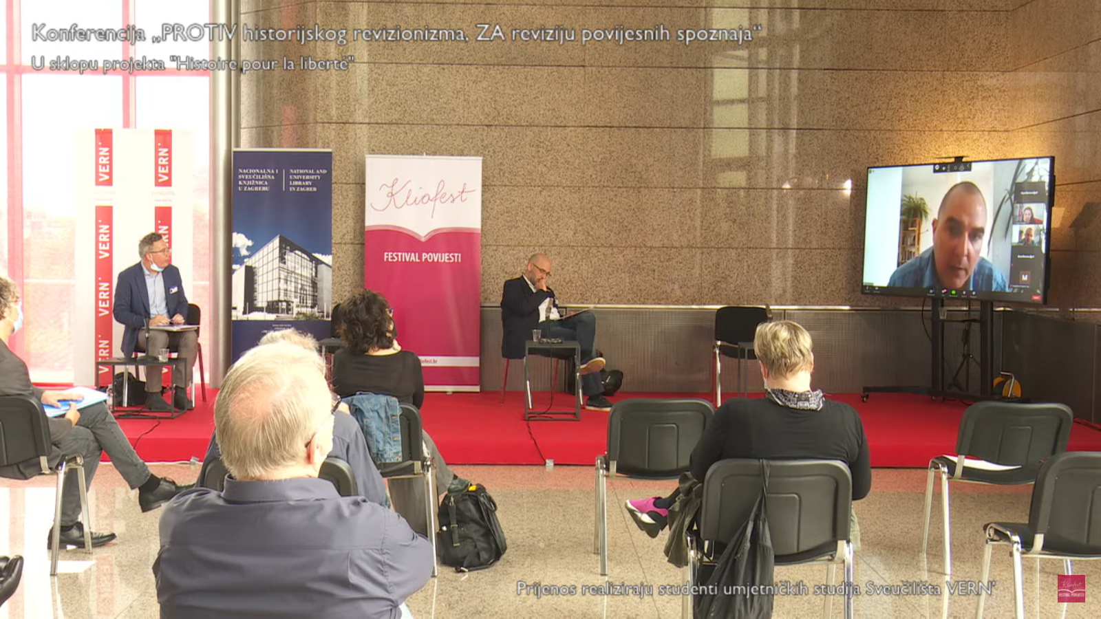 Im Rahmen des Kliofests, das bereits am Vortag begonnen hatte, fanden mehrere Einzelveranstaltungen zu ganz unterschiedlichen Themen statt. Unser Teil, der von 11:00 bis 14:00 Uhr dauerte, trug den Titel WIDER den historischen Revisionismus, FÜR die Revision historischer Erkenntnis (PROTIV historijskog revizionizma, ZA reviziju povijesnih spoznaja). Dieses Thema und die Teilveranstaltung waren wiederum Teil eines größeren Projekts mit dem Titel Histoire pour la liberté (Geschichte für die Freiheit), das sich mit dem weiteren Kontext des geschichtlichen Revisionismus in der Region befasst — aber auch darüber hinaus, wie etwa in Deutschland, Europa weit und global. Von der großen Aktualität und Relevanz des Themas in der Region zeugen die sich überschlagenden Nachrichten, Film- und Serienproduktionen in der Region, die zu großen öffentlichen Debatten und Verwerfungen führen. Wie Dubravka Stojanović aus Belgrad es in ihrem Beitrag pointiert hat, wird damit „die psychologische Möglichkeit neuer Probleme“ und schlimmstenfalls der Grund für erneute Konflikte geschaffen.
