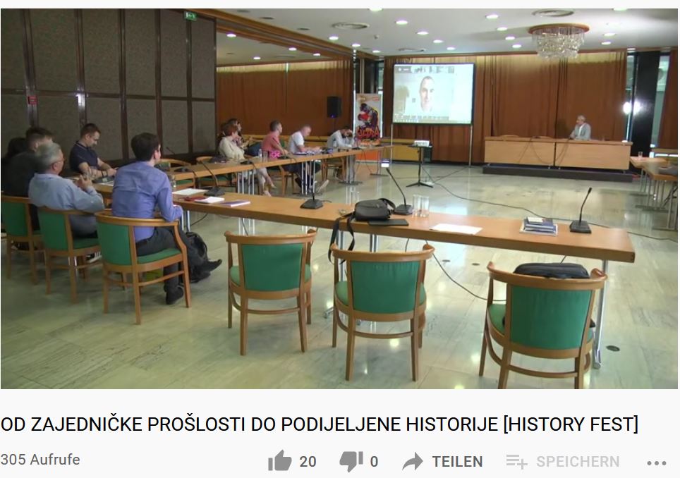 Das History Fest ist eine regelmäßige Veranstaltung, das vom Verein UMHIS ( Udruženje za modernu historiju / Udruga za modernu povijest / Verein für Moderne Geschichte) kuratiert wird. Dieser ist als Ausgründung der Universität Sarajevo bzw. des Instituts für Geschichte zu sehen, wo in den letzten Jahren einige der oben erwähnten Grabenkämpfe um die „richtige Sicht“ auf Geschichte geführt und mit Machtfragen verknüpft werden. Das History Fest findet seit einigen Jahren einmal jährlich statt und hat eine eigene Homepage (History Fest). Es ist im Format vergleichbar mit dem Kliofest in Zagreb, das an die dortige Universität angebunden ist und an dem Ruža Fotiadis und ich vor wenigen Wochen als Vertreter(in) der Humboldt-Universität ebenfalls teilgenommen haben. Darüber habe ich einen Bericht geschrieben und auf meiner Homepage veröffentlicht. Wie in Zagreb, so haben wir auch in diesem Fall aus spät-pandemischen Gründen leider nicht vor Ort, sondern via Zoom-Schalte teilgenommen (was ich persönlich durch meine besondere Verbindung nach Sarajevo diesmal besonders bedauerlich fand). Das gesamte Panel wurde live über Youtube übertragen und kann dort abgerufen werden