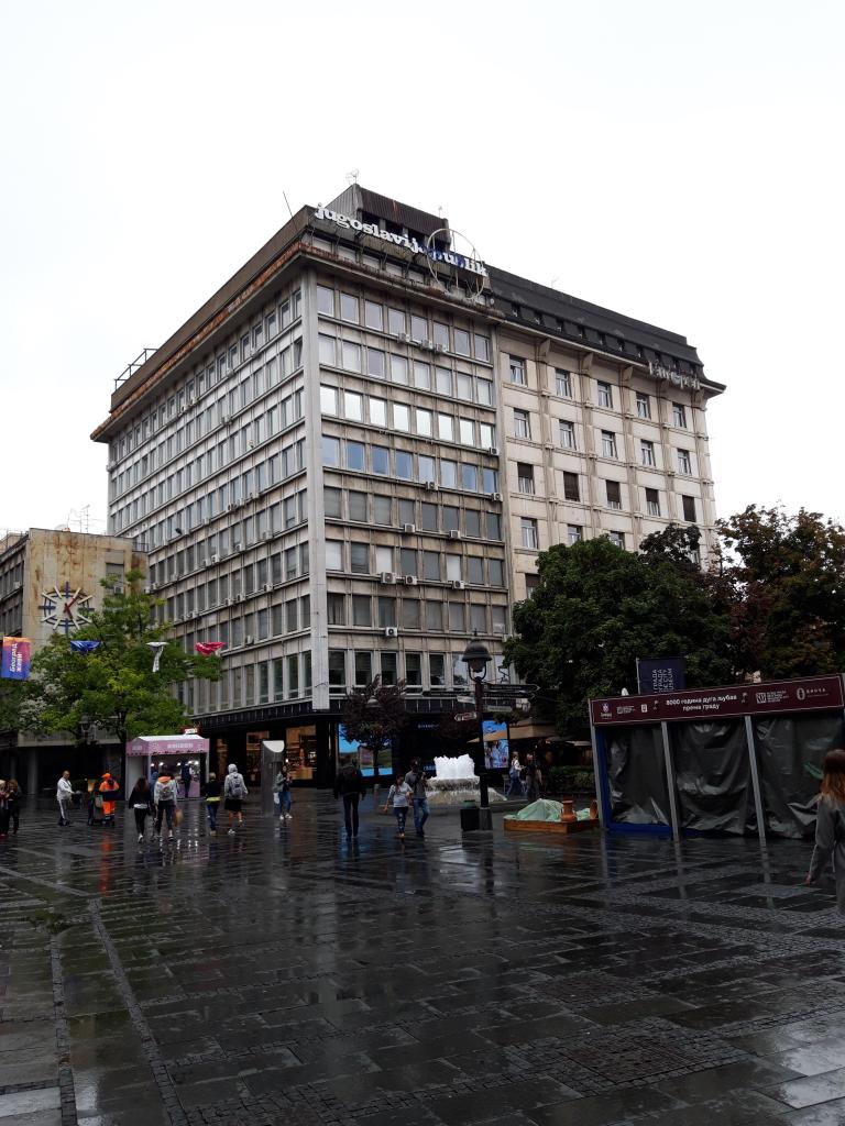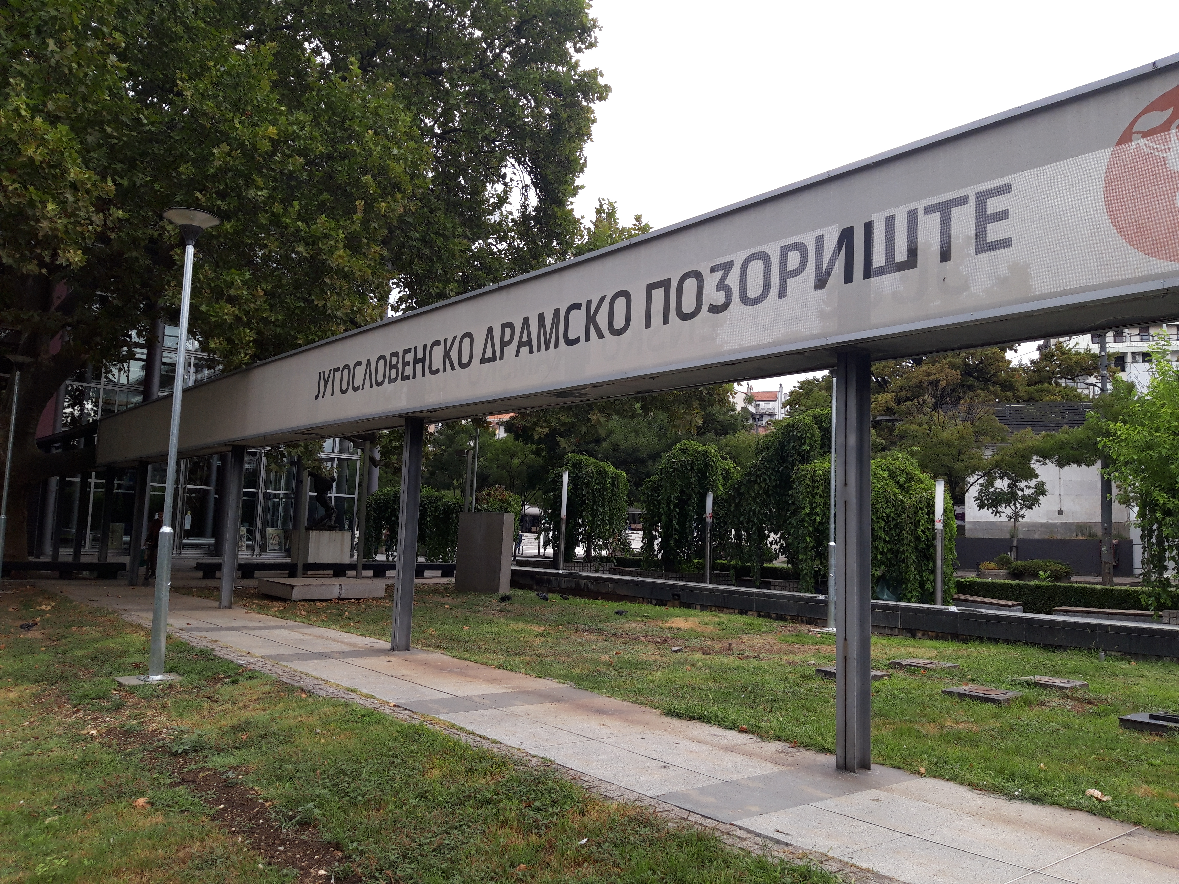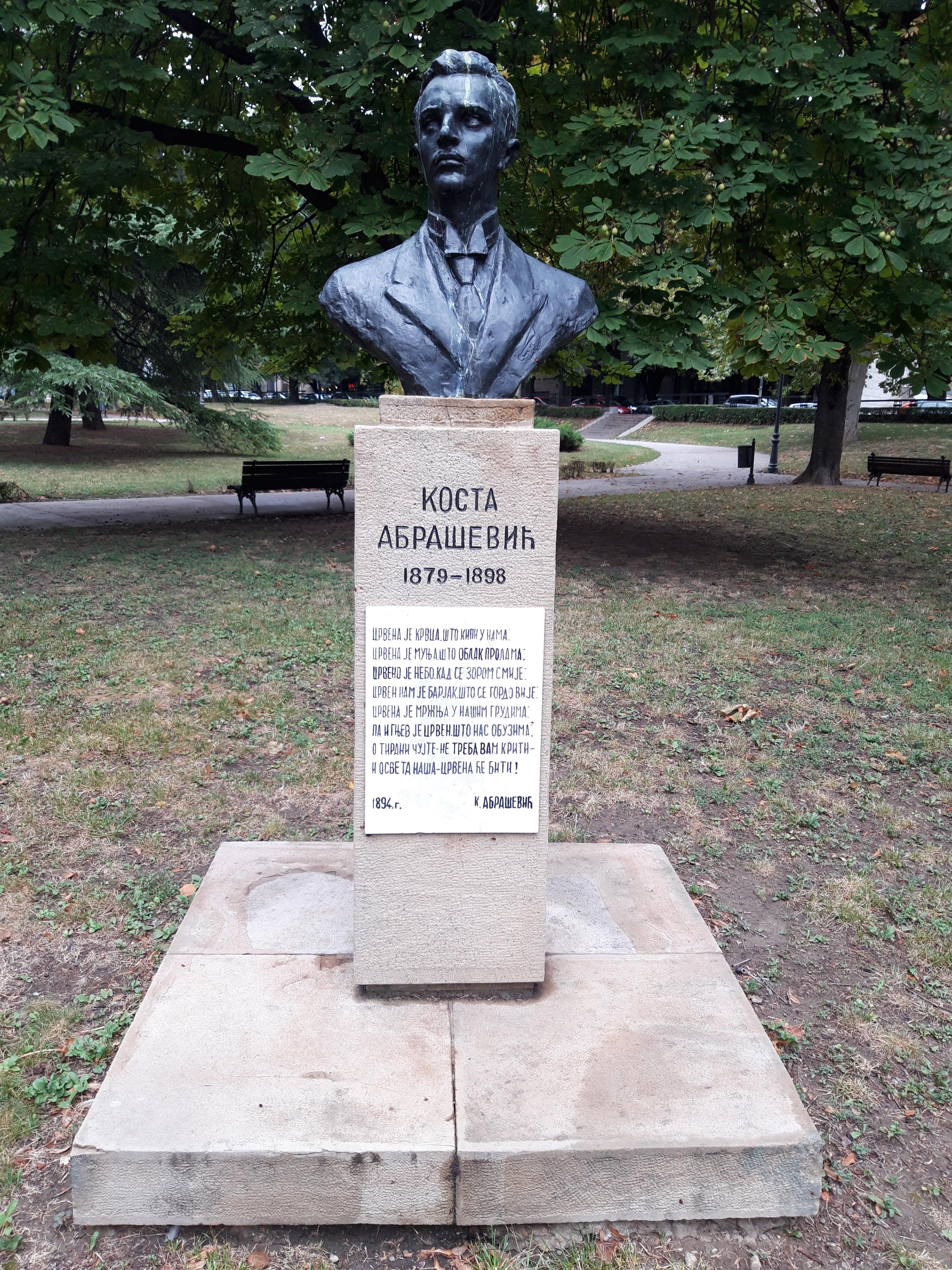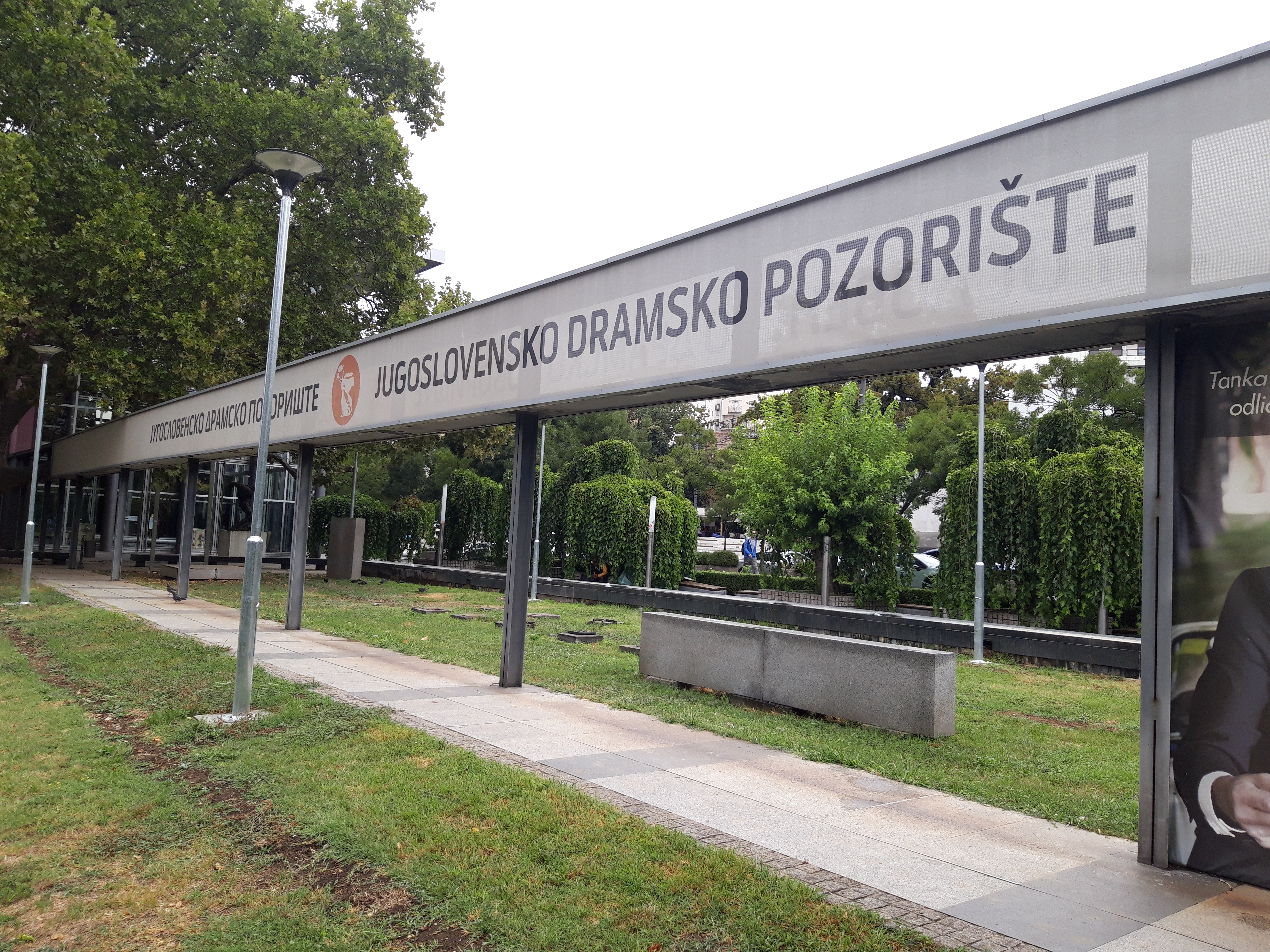 Am Park Manjež, der sich ganz in der Nähe meines Hotels in der Resavska ulica befindet und als Ausgangspunkt des ersten Belgrad Prides auch überregional größere Bekanntheit erlangt hat, befindet sich das Jugoslawische Drama-Theater (Jugoslovensko Dramsko Pozorište), das 1947 gegründet wurde und als das repräsentative Theater Jugoslawiens schlechthin galt. Dort standen zahlreiche jugoslawische Schauspielgrößen aus Zagreb, Split, Ljubljana, Sarajevo, Belgrad, Novi Sad und anderen Orten des geteilten Staates auf der Bühne. Auch heute noch trägt es seinen alten Namen, der in großen kyrillischen und lateinischen Lettern — den beiden offiziellen Alphabeten Serbiens — in die linguistische Landschaft der serbischen Hauptstadt spricht. Unbedingt erwähnen möchte ich außerdem das Denkmal für Kosta Abrašević, das im Park Manjež steht: dieser Dichter aus einer serbisch-griechischen Familie aus dem damals osmanischen Ohrid im heutigen Nordmazedonien ist mit nur 18 Jahren im Jahr 1898 — vor der Gründung des ersten jugoslawischen Staates — gestorben. Da er aber oft als frühsozialistischer Dichter kolportiert wird — was angesichts seiner kurzen Lebensspanne als gewagte politische Einordnung erscheinen muss — begegnet man seinem Andenken noch heute an so unterschiedlichen Orten wie Belgrad und Mostar. Auch dieses Andenken datiert ganz eindeutig in die jugoslawische Epoche. In Mostar ist das autonome Kulturzentrum OKC Abrašević nach ihm benannt, das im Krieg vollkommen zerstört worden ist, aber nach dem Krieg von der unabhängigen Jugendkulturszene Mostars reappropriiert und als völlig neues Projekt unter altem Namen wieder aufgebaut wurde. Allen Freiwilligen, Aktivistinnen, NGO-Angehörigen und Personen aus dem alternativen Kulturmilieu der frühen 2000er Jahre in Mostar und Sarajevo (und darüber hinaus) ist „das Abrašević“ ganz eindeutig ein Begriff. Allen Mostaris gilt der Name außerdem als Symbol der jugoslawischen Zeit — bevor der Bulevar ihrer Stadt zur Unkenntlichkeit zerstört worden ist, und bevor die ethno-nationalistische de facto Teilung Mostars einsetzte. Auch dieser Aspekt scheint mir deshalb bemerkenswert: die „jugoslawischen“ Denkmäler und Symbole Belgrads sprechen nicht nur für sich, sondern korrespondieren mit ihren Pendants an anderen Orten im ehemligen geteilten Staat Jugoslawien.