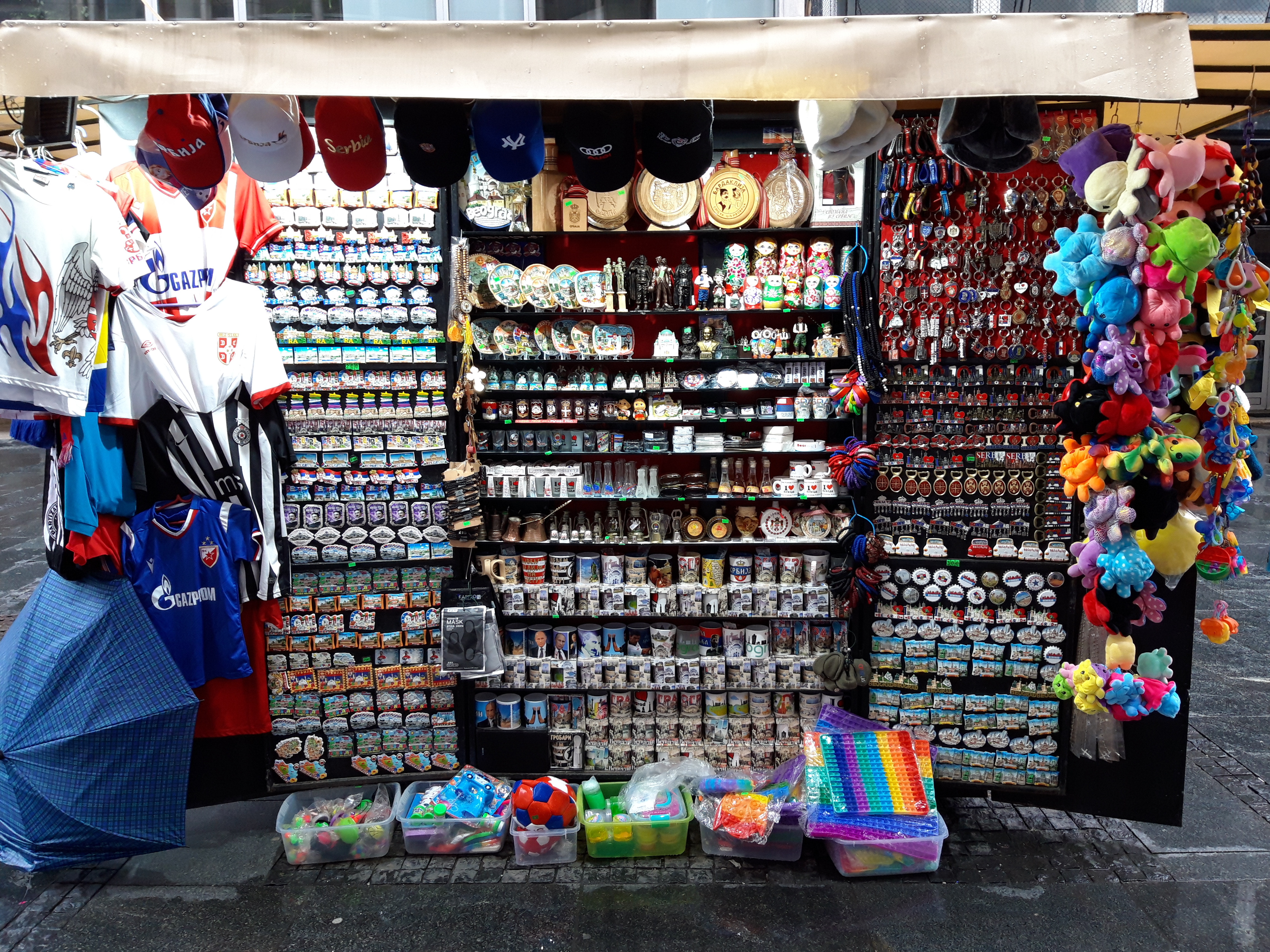 Außerhalb dieser Kreise gilt es als verbranntes Symbol: Es wird als Chiffre für großserbischen Nationalismus, Gebietsansprüche und die damit einhergegangene Gewalterfahrung gelesen. Der Super Serb von Anfang der Nullerjahre stand damals nicht allein auf den Souvenirständen zum Verkauf: um ihn herum fanden sich Konterfeis von Kriegsverbrechern wie Mladić, Karadžić oder Šešelj, die analog zum Super Serb wie Heldenfiguren daherkamen. Auch wenn sich der Super Serb aus dem Repertoire verabschiedet zu haben scheint — ich habe ihn 2021 zumindest nicht mehr gesehen — hat sich in dieser Hinsicht nicht viel geändert, wie die Bilder unten zeigen. Wenn dies schon für mich ein sehr mulmiges Gefühl erzeugte, wie mag es dann erst für postjugoslawische BesucherInnen Belgrads gewesen sein, die direkt von der Gewalt der 1990er betroffen waren?