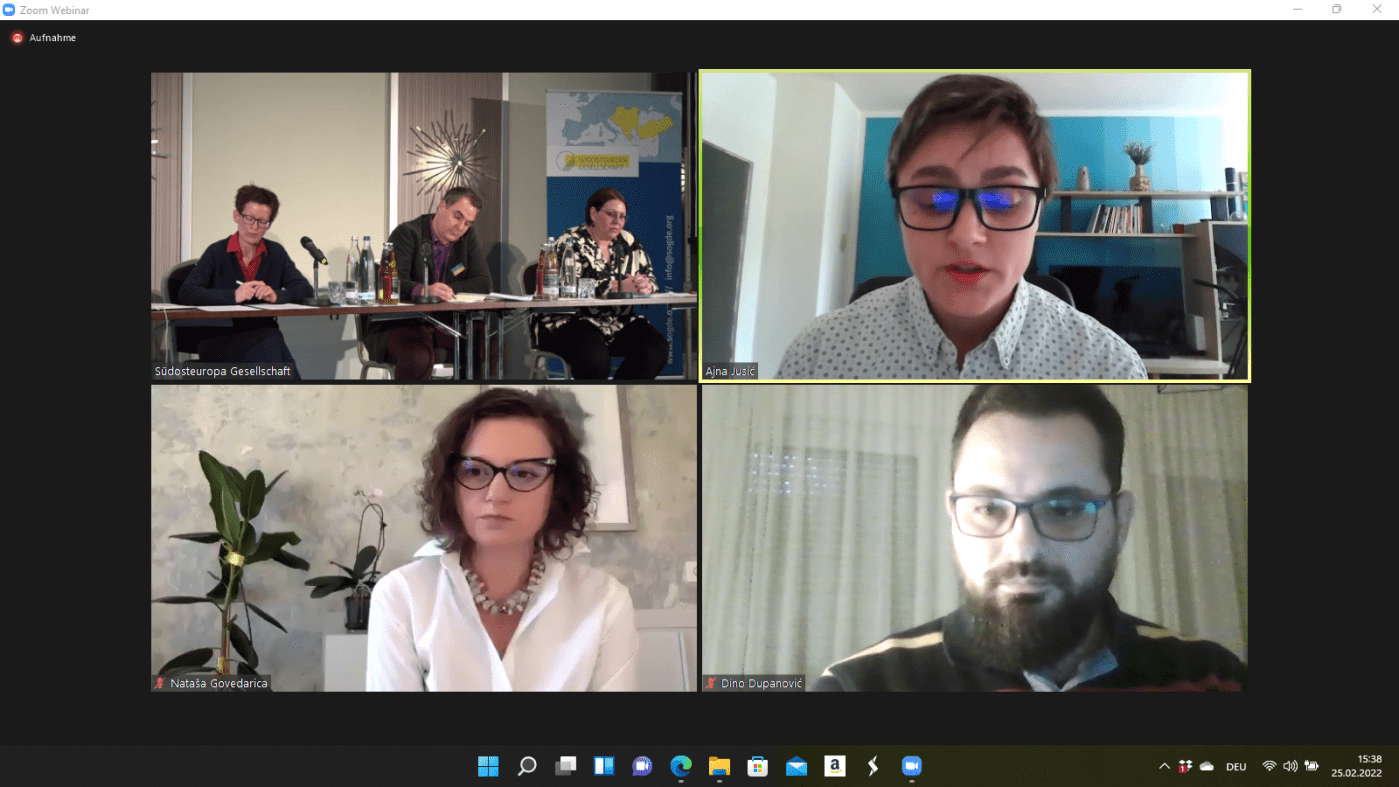 Am 25. Februar 2022 hatten Emina Haye und ich die Gelegenheit, unser Blog- und Buchprojekt Bosnien in Berlin (BiB) auf einem Symposium der jährlichen Sitzung des wissenschaftlichen Beirats der Südosteuropa-Gesellschaft (SOG) in Berlin vorzustellen. Die SOG (mit Sitz in München) ist eines der Flaggschiffe auf dem Gebiet der politischen, wirtschaftlichen, kulturellen und wissenschaftlichen Beratung und Forschung zu Südosteuropa im deutschsprachigen Raum und wird institutionell gefördert vom Auswärtigen Amt. Das öffentliche Symposium mit dem Titel 30 Jahre nach Beginn des Krieges in Bosnien und Herzegowina: Was bedeutet es, sich auf die junge Generation zu verlassen? wurde von Dr. Heike Karge von der Universität Regensburg organisiert (Programm).