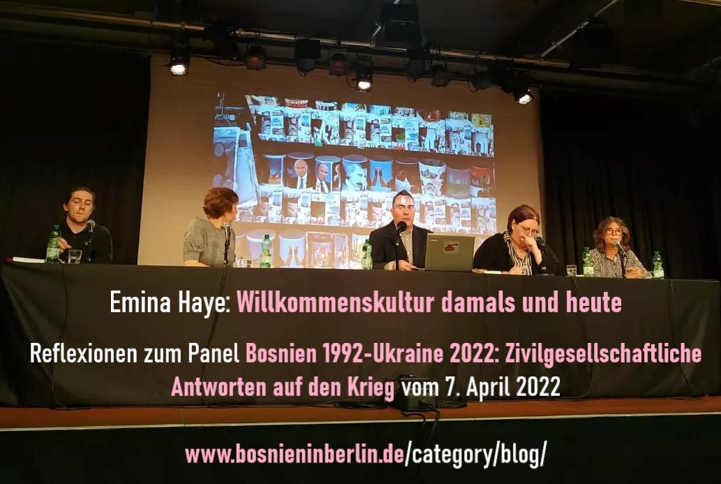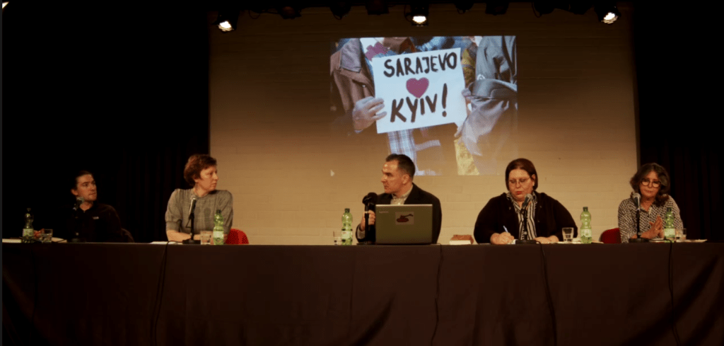 Am 7. April 2022 hat ein Bündnis aus sieben Partnerorganisationen ein Diskussionspanel in Berlin veranstaltet, auf dem es sowohl um den Jahrestag des Kriegsausbruchs in Bosnien-Herzegowina vor genau 30 Jahren als auch um den Angriffskrieg des Putin-Regimes auf die Ukraine 2022 ging. Zusammen mit Vertreter:innen aus Zivilgesellschaft, Forschung und Politik haben wir über unmittelbare Formen der Solidarität mit der Ukraine gesprochen, aber auch über Erfahrungswerte aus Bosnien (in Berlin). Dabei haben wir auch über Unterschiede und Gemeinsamkeiten beider Kriege und ihrer Folgen über Grenzen hinweg diskutiert.