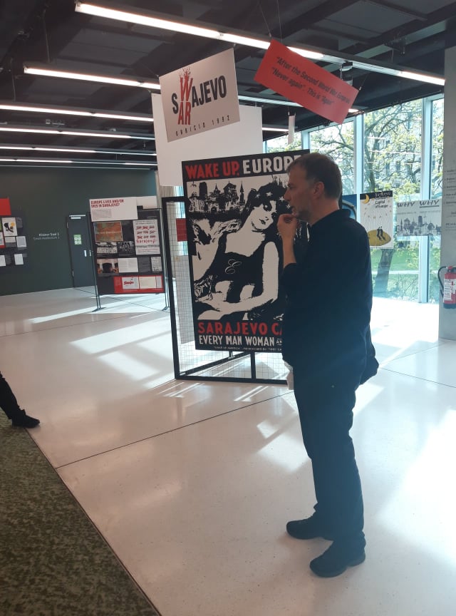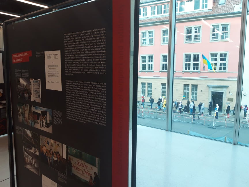 Das Datum der Veranstaltung (7. April) war nämlich nicht zufällig gewählt: In Bosnien-Herzegowina (BiH) wird der Vortag, der 6. April, seit langem im Zusammenhang mit Krieg erinnert. Deshalb fanden besonders am Vortag eine Reihe anderer Veranstaltungen statt, wie zum Beispiel in der Heinrich Böll Stiftung mit der Fachkonferenz Bosnien-Forum 2022, an dem auch ich ganztägig teilgenommen hatte. Dort wurde außerdem die Ausstellung Wake up, Europe! eröffnet, die der Historiker Nicolas Moll vom Historischen Museum (Historijski Muzej) Sarajevo nach Berlin gebracht hatte (das Kommen der Ausstellung war im Januar durch Moll bereits angekündigt worden). Die sehr sehenswerte Ausstellung über europäische Solidaritätsaktionen während des Bosnienkrieges 1992-1995 wird dort in vielen unterschiedlichen Facetten beleuchtet und durch Originalmaterial illustriert. Trotz dieser und weiterer Parallelveranstaltungen, die sich weniger mit dem russischen Angriffskrieg auf die Ukraine beschäftigten als unser Panel, interessierten sich also dennoch zahlreiche Menschen für den überlappenden Kontext, den ich im Folgenden nur sehr kurz skizzieren will — ausgehend von Bosnien 1992. (weiter nach den Bildern)