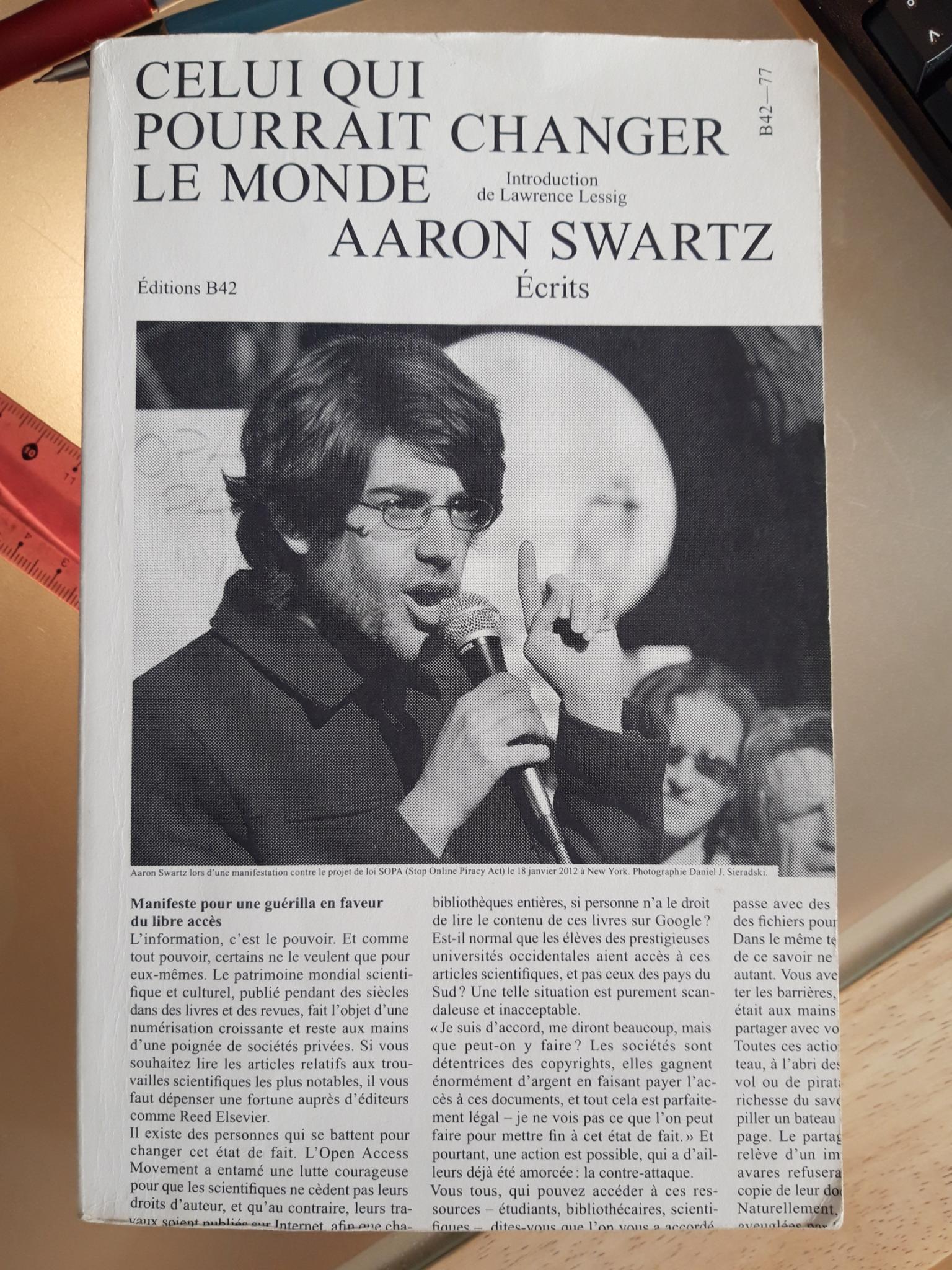 - Swartz, Aaron / Lessig, Lawrence (2017): Celui qui pourrait changer le monde. Aaron Swartz: Écrits. Introduction de Lawrence Lessig (Textes traduits de l’anglais (États-Unis) par Marie-Mathilde Bortoletti et Amarante Szidon. Paris: Éditions B42.