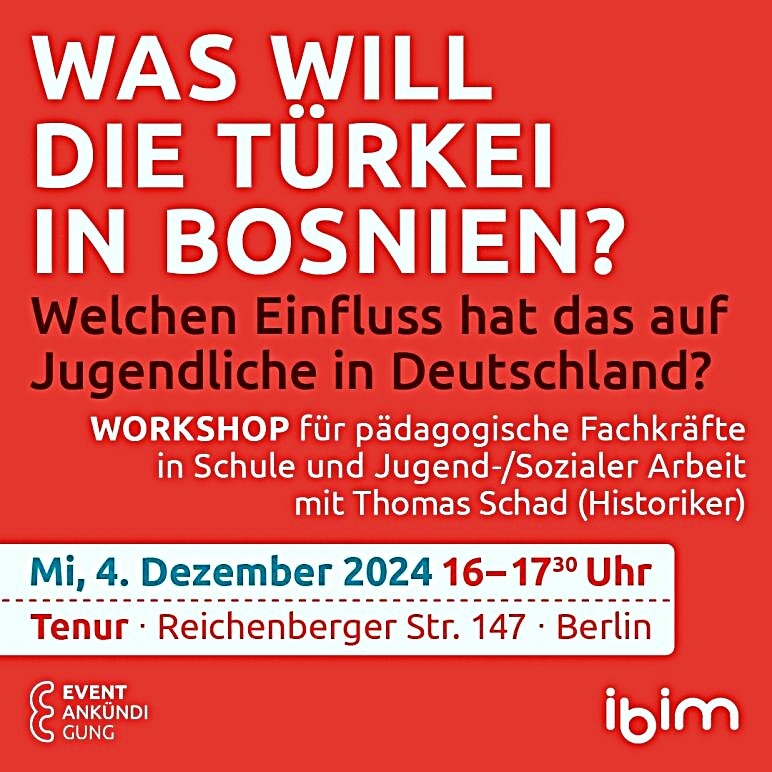 In einem Vortrag stellt Thomas Schad unterschiedliche Aspekte der türkischen Einflussnahme in Bosnien und ihre Hintergründe vor und betrachtet einige der Auswirkungen in Deutschland. Im anschließenden Gespräch tauschen wir uns über eigene Beobachtungen aus und diskutieren, wie die türkischen Einflüsse auf hiesige Jugendliche wirken und zu bewerten sind.