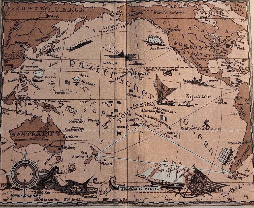 Das für meinen damaligen Bewusstseinszustand Unerhörte an dem Buch war erstens, dass es unter den Angeheuerten eine Frau gab, die „ab und zu ein bisschen Hasch“ rauchte, was der sie anheuernde Kapitän Gunnar Thorkild aber nicht ernsthaft schlimm zu finden schien. In meinem Umfeld gehörte das Wort Haschisch damals zur Kategorie Rauschgift und war mit Heroin und anderen, todbringenden Drogen gleichzusetzen. Zweitens gab es ein schwules Pärchen, was offenbar ebensowenig zu den Todsünden gerechnet wurde, obwohl an einer Stelle eine Warnung vor dem schlechten Einfluss auf Jugendliche formuliert wurde, was der Leser aber als ungerecht empfindet. Drittens schienen politische Grenzen in dem Buch nicht die geringste Rolle zu spielen, wenn ich mich richtig erinnere, und die Crew war völlig divers zusammengewürfelt; außerdem schien es möglich, norwegisches und polynesisches Seefahrerwissen zu verbinden, erfahrungsdurstig in die Welt hinauszustapfen und Neues zu entdecken — und das war ganz nach meinem Geschmack. Die erste Lektüre ist zirka 30 Jahre her, aber vielleicht lese ich es bald noch einmal.