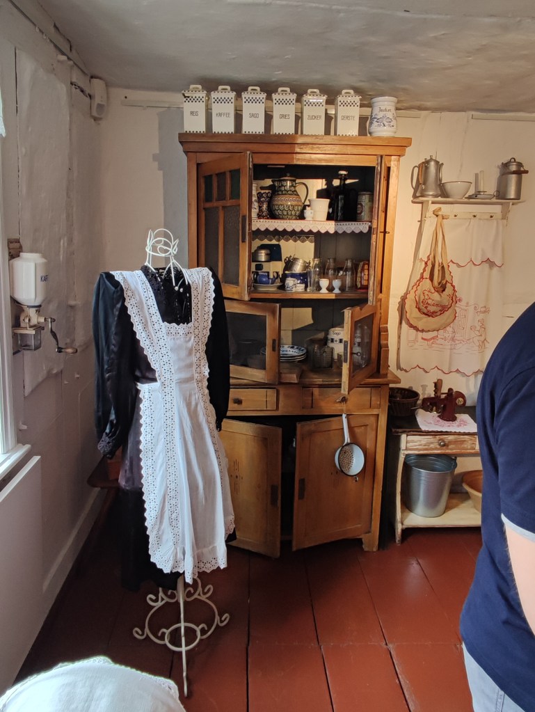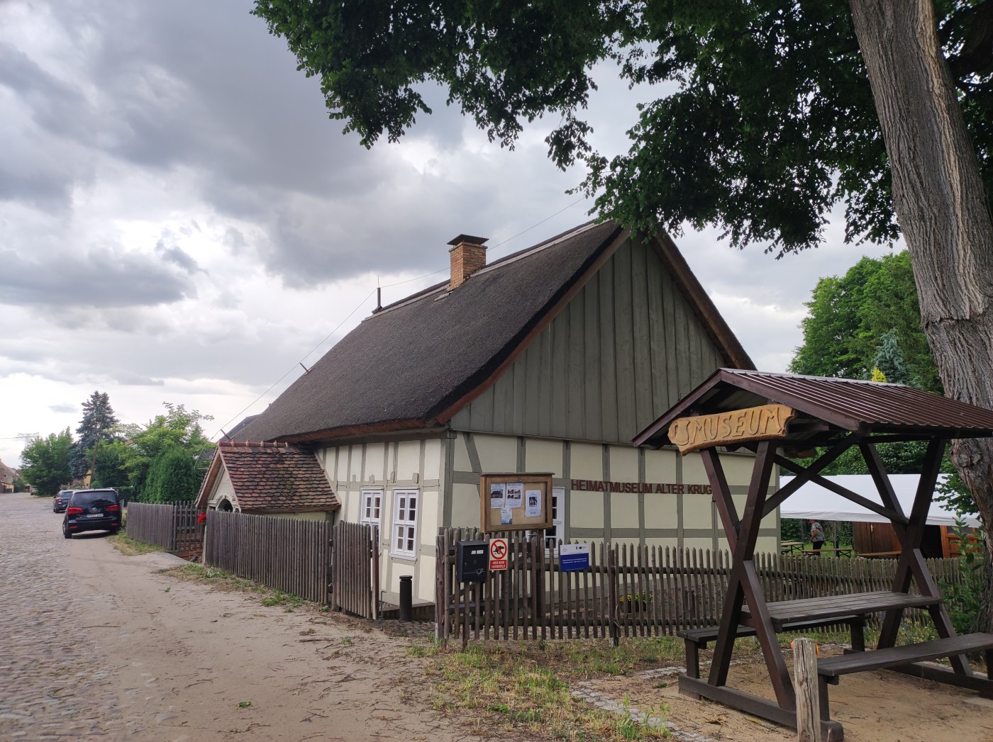 Ich hatte gestern die Gelegenheit zu einer Fortbildung über Fotografie und Filme im musealen Bereich in Zossen, etwas südlich von Berlin im Landkreis Teltow-Fläming gelegen. Zu meiner Überraschung war ich gar nicht der einzige, der mit öffentlichen Verkehrsmitteln und Fahrrad angereist bin — und ich habe das Museum des Heimatvereins „Alter Krug“ Zossen e.V. tatsächlich auf Anhieb gefunden. Die Hausherrin Frau Andrae begrüßte uns im reetgedeckten Hauptgebäude des merkwürdig verschachtelten Hauses, das einen riesigen Ofenraum mit Küche und geschwärzten Kaminwänden beinhaltete. In diesem Raum roch es ein wenig so, als hätte dort vor einiger Zeit ein gallisches Dorf ein paar Wildschweine gegrillt. Sie nannte das Gesamtwerk liebevoll eine „Butzebude“ — irgendwie passend. Das Innere ist behangen mit Bildern eines örtlichen Malers, der sich dem Abmalen von Postkarten gewidmet hatte. Mir sprang sofort ein Allgäu-Panorama ins Auge. Leider ist es aus merkwürdigen Gründen strengstens untersagt, die Gemälde zu fotografieren, so dass ich dies auch unterließ.